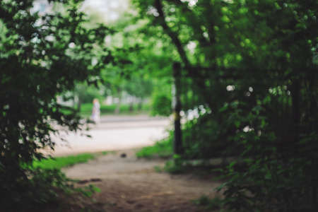Defocused view on urban street from forest between trees. Exit from dark forest in roadway. Bokeh background with nature and city nearby. Get out of park. Fence between civilization and woods in blur.