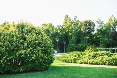 Empty public park with lush high green trees and green grass lawn. Tranquil nature landscape with sun light, no people.