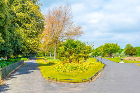A pathway in spring garden in a shadow of green trees. Trimmed bushes and blooming flowers. Tropical landscape. Botanical park nature in daytime.