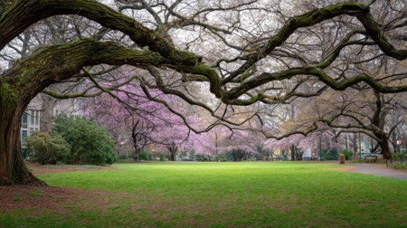 A tranquil urban park scene showcasing impressive trees with sprawling branches and vibrant spring blossoms. The lush green grass invites relaxation and reflection.