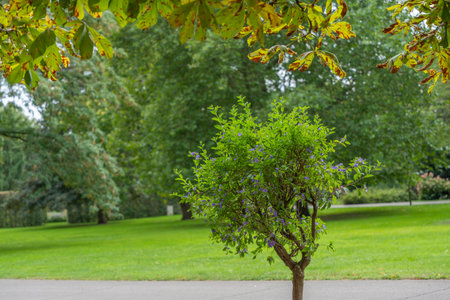 A small tree with fresh green leaves and delicate purple flowers grows in a park. Autumn leaves frame the view above.