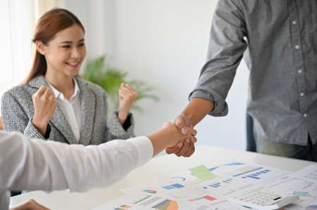 Greeting new colleagues team, business people shaking hands during a meeting to sign agreement and become a business partner, Successful businessman handshake after good deal for both companies.