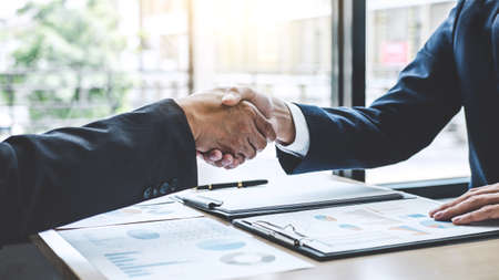 Teamwork partnership meeting concept, Two confident Business shaking hands after discussing good deal of trading contract and new projects for both companies.