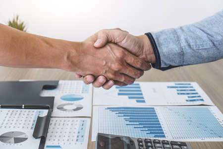 Shaking hand two business leaders talk about charts, financial graphs showing results are analyzing and calculating planning strategies, business success building processes.