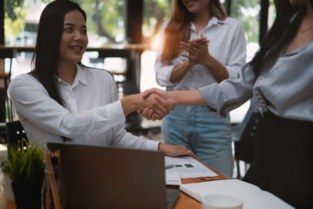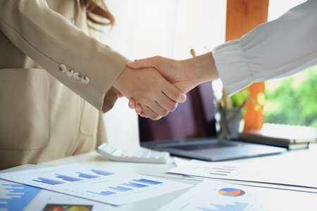 Hands of two businesswomen Shaking Hands after agreement collaboration together in office. Partnership teamwork success concept.