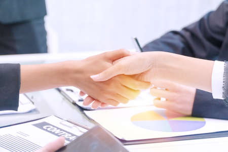 Teamwork of business partnership Handshaking after good cooperation, Consultation between businessman and customer, Trading contract and new projects for the company, Meeting and greeting concept.