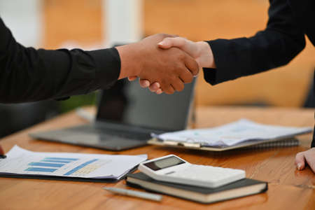 Close up of Business people shaking hands, finishing up meeting, business etiquette, congratulation, merger and acquisition concept