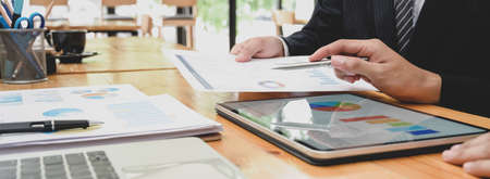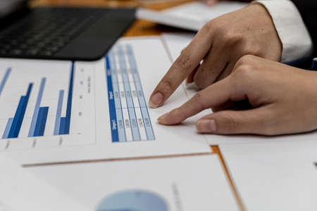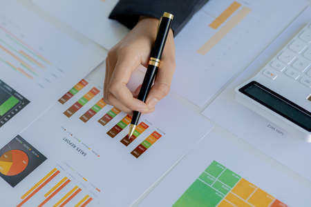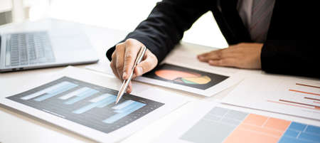 Businessmen are examining company financial information from documents prepared by the finance department, financial documents placed on their desks displayed in bar charts. Financial concept.