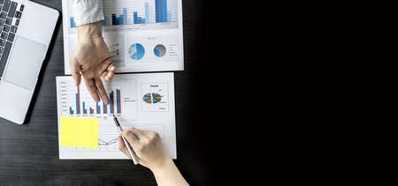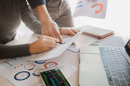 Business team is brainstorming with charts and analyzing or studying for investments.