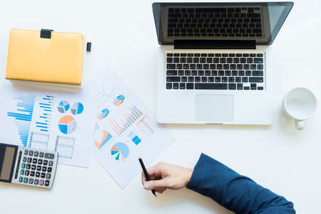 businessman holding pen to work computer graphs and charts data statistical data financial analysis documents.