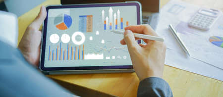 Business hand hold stylus pen touch screen digital tablet with business diagram on the table workspace.