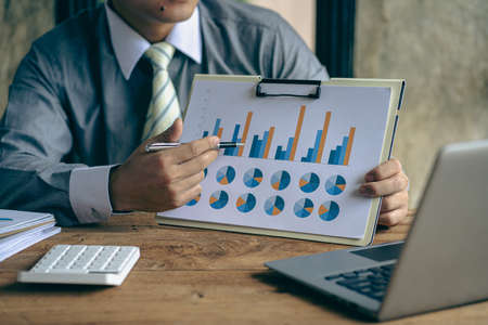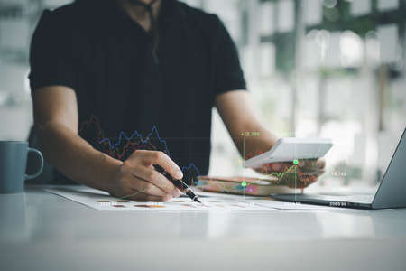 The businessman's hand sits at their desks and calculates financial graphs showing results about their investments, plan a successful business growth process.