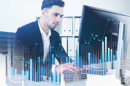 Serious young trader using computer in blurry office with double exposure of financial graphs. Concept of stock market. Toned image