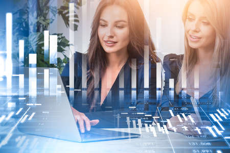 Two office woman with computer looking at the screen, double exposure with stock market changes hologram with numbers and candlesticks. Concept of partnership