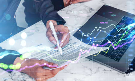 Two stock investors are brainstorming stock trading plans and reading stock market analysis, cryptocurrency investing, chart analysis and indicators to make profits in stocks. investment idea