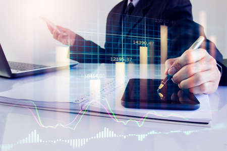 Businessman report graphs and charts of financial statements and profit growth holding a pen and mobile phone at desk.Business concept of digital communication technology