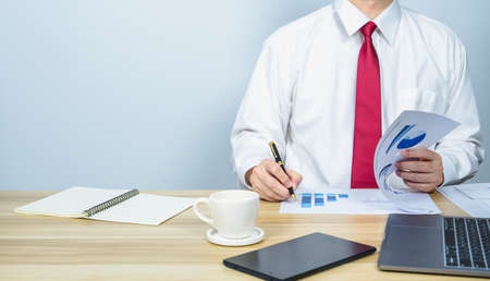 executive write on data graph document on working desk with white copy space background for making meeting presentation, professional businessman busy work on the business data graph