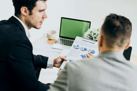 Two businessmen are meeting together on company sales, they are business partners who open the company together, they are brainstorming and analyzing how to manage the company's sales growth.