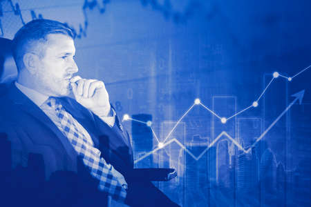 Double exposure of pensive businessman looking at growth finance chart while sitting on the chair with modern city background