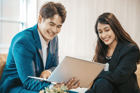 Business couple sitting together with laptop and checking work on sofa in the office.