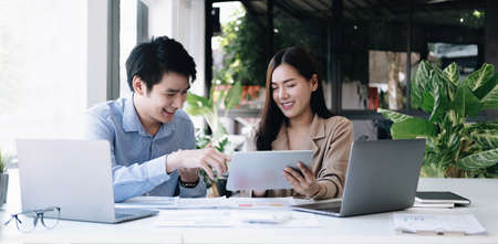 Young Asian couple or coworker talking at coffee shop or modern office, garden background. With laptop notebook, smartphone and digital tablet. Modern lifestyle with computer gadget technology concept