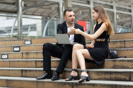 Two Western male and female businessmen sit and talk on the outdoor stairs. Both of them raised their hands and were happy that the work achieved their goals.