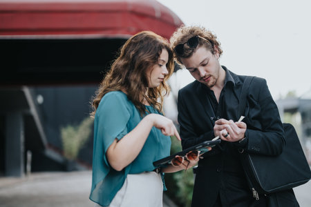 Two business people looking at papers. outdoors