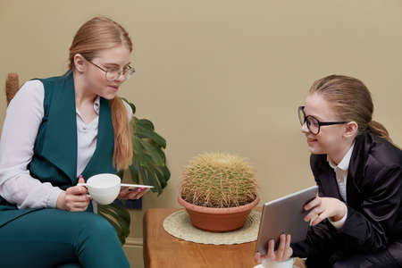 Two young beautiful girls chatting on a break with a mug of coffee. The girl shows the photo in the tablet. Lunch break.