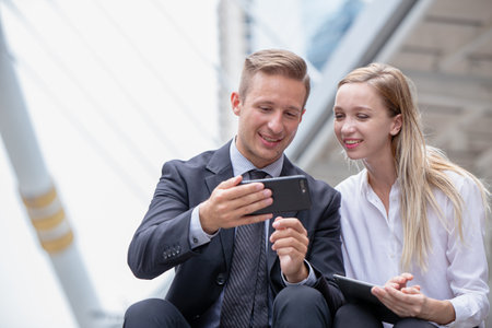 Business people enjoy playing smartphone together at city outdoor, Businessman and woman looking mobile phone happy smiling