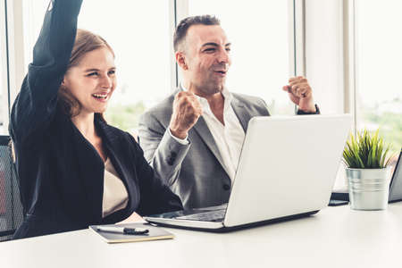Happy business colleagues using laptop. Overjoyed couple look at laptop screen, excited happy young husband and wife read good news.