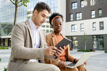 Young businessman with digital tablet consulting with African female colleague