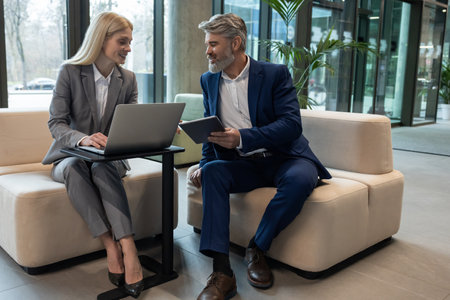 Two business colleagues are discussing a future meeting in a cozy nook: a hispanic man entrepreneur with a laptop in the defocused background and his caucasian female colleague with a digital tablet