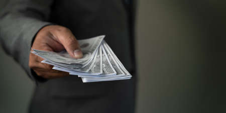 The rich businessman hands show the money American dollars Income and Business concept.
