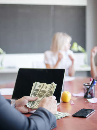 The company's procurement manager is contracting a partner company, accepting large amounts of bribes in dollar bills to cooperate in defrauding the company, fraud is illegal and immoral.
