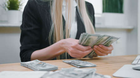Crop view of female in elegant suit sitting at wooden desk and counting large bundle of dollar banknotes in hands