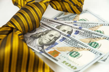 cash one hundred dollar money with mens yellow black striped tie on white background