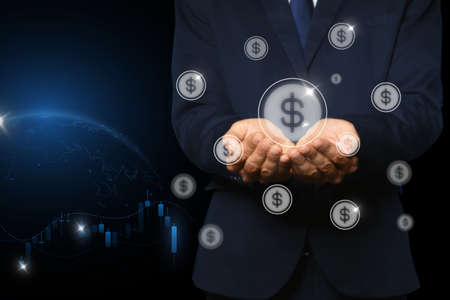 Businessman holding banknote and investment on business global network, and chart currency exchange, stock market diagram, banking, financial and digital marketing, online banking technology.