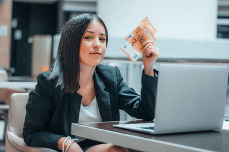 Successful SMM woman. Money making business. Female at workplace with dollar bills in hands. Great work, good profit.
