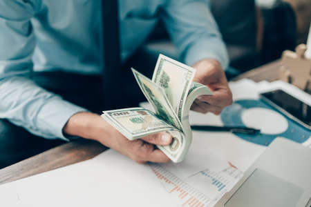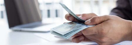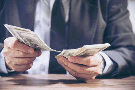 Man in suit counts wad of money before signing contract. Close up of hands with money us dollars