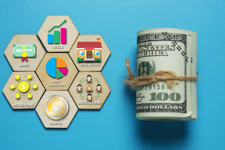 Hexagon wood shape with financial instrument and option together fake money insight. Learn to invest and growth the income concept