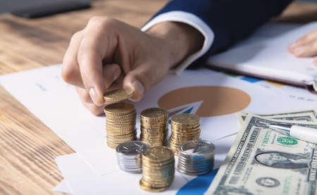 business man, documents and coins placed on a pile of money, saving on the table. The concept of financing business.