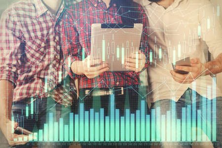 Double exposure of forex graph drawing and man and woman working together holding and using a mobile device. Trade concept.