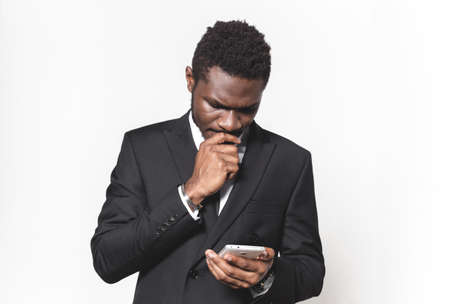 Portrait of a young AfroAmerican in a business suit. emotions on the face. man thinks with mobile phone , isolated on white background, free space for text