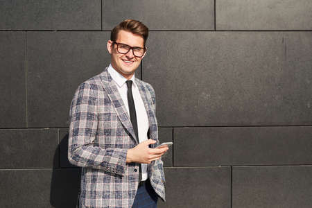Portrait of young businessman in eyeglasses and checked jacket smiling at camera while using his mobile phone outdoors