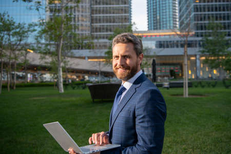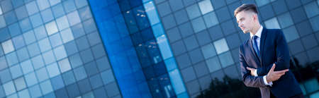 business success. successful man in businesslike suit. manager executive outside the office