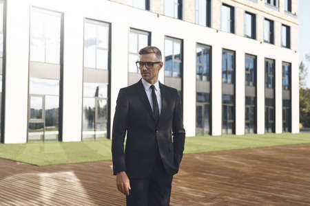 Confident mature businessman in eyeglasses looking away while standing in front of office building