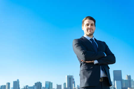 Portrait of a businessman, blue sky and buildings of big city