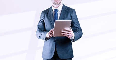 Confident professional businessman in black suit holding digital tablet and standing in bright modern office.