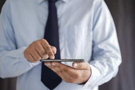 businessman holding his mobile phone, texting or preparing a call. Bright and modern business photo. A man wearing a suit and shirt while using technology. A professional accountant, consultant, auditor, ceo or sales person. A guy communicating through his cellphone.