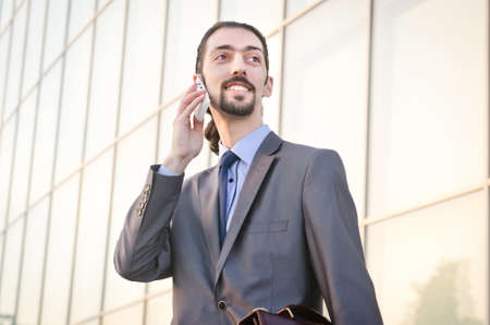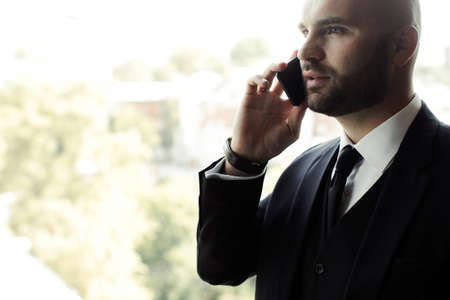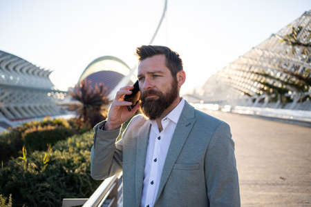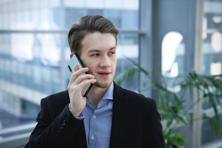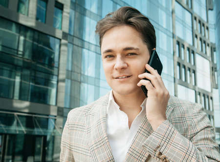 Close up portrait of serious businessman talking on mobile phone. Young businessman with cell phone near business center
